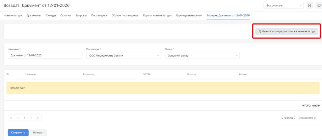 Для наполнения документа номенклатурами необходимо вверху страницы выбрать опцию “Добавить позицию из списка номенклатур”