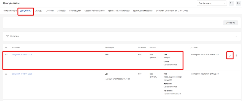 После сохранения без проведения, количество по документу НЕ будет списано со склада и для завершения проведения можно будет вернуться позже, найдя документ в списке документов склада и нажав опцию “Редактировать”