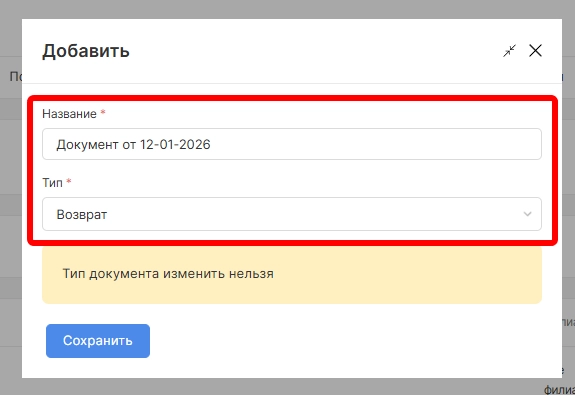 указать тип документа “Возврат”