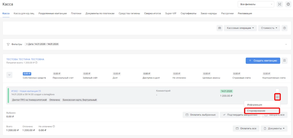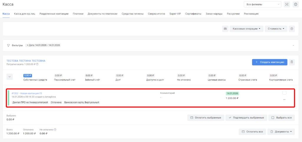 в модуле “Касса” или кассовом разделе инфокарты пациента необходимо найти оплаченную ранее квитанцию на товарные позиции