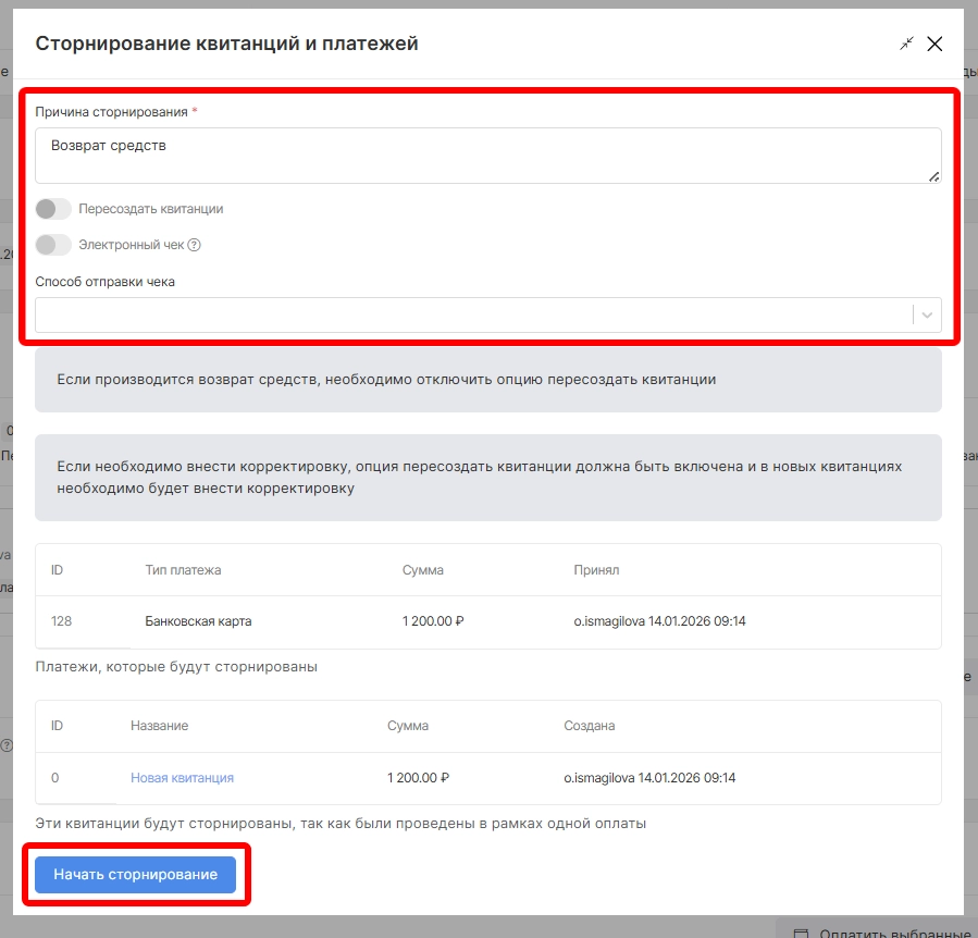 в открывшейся форме необходимо указать причину сторнирования, отменить пересоздание квитанции (в случае полного возврата денег пациенту) и подтвердить опцией “Начать сторнирование”
