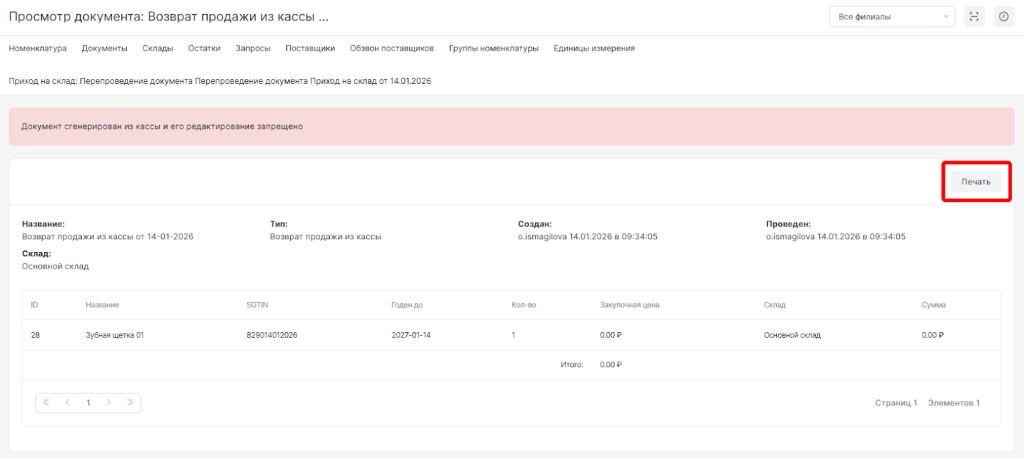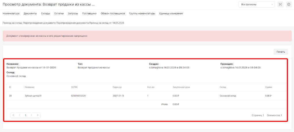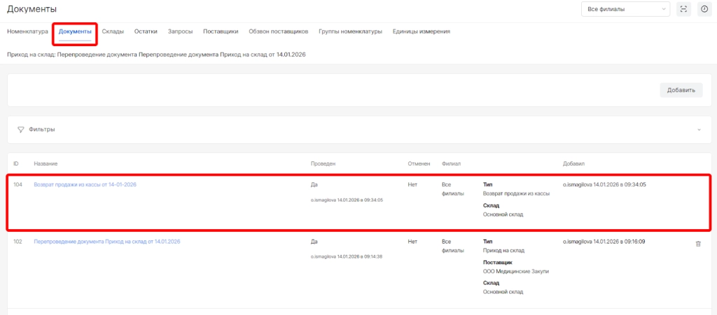 После того, как квитанция будет сторнирована в модуле “Склад” во вкладке “Документы” отобразится тип документ “Возврат продажи из кассы”