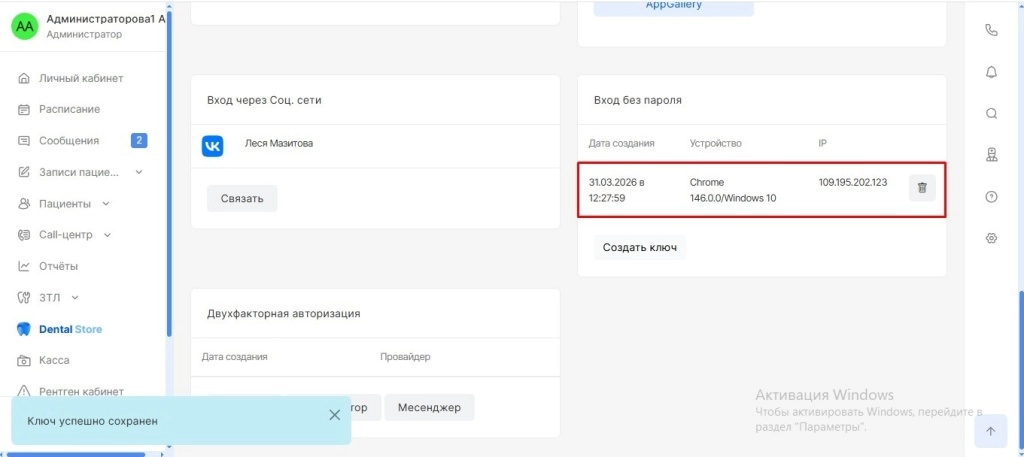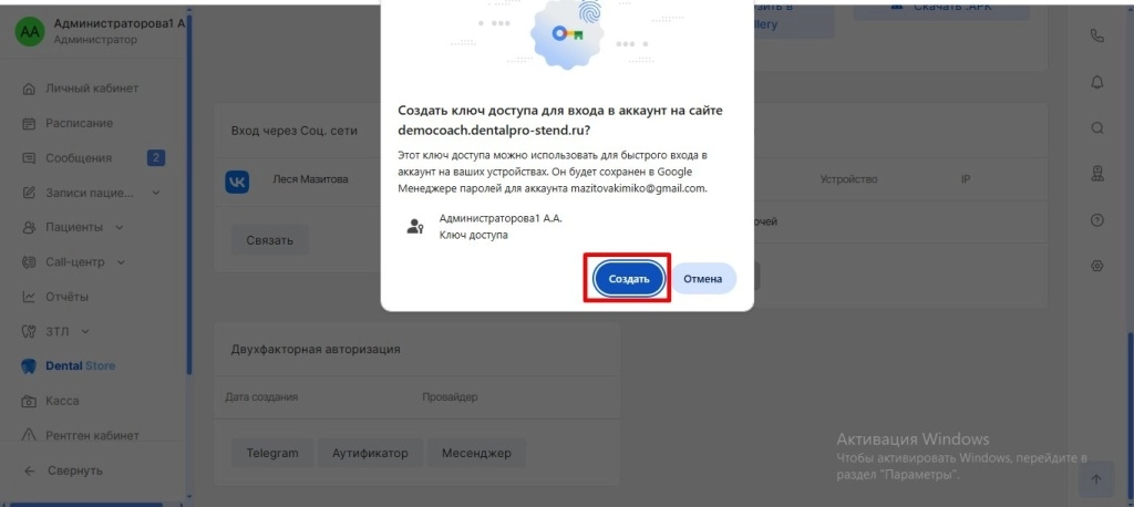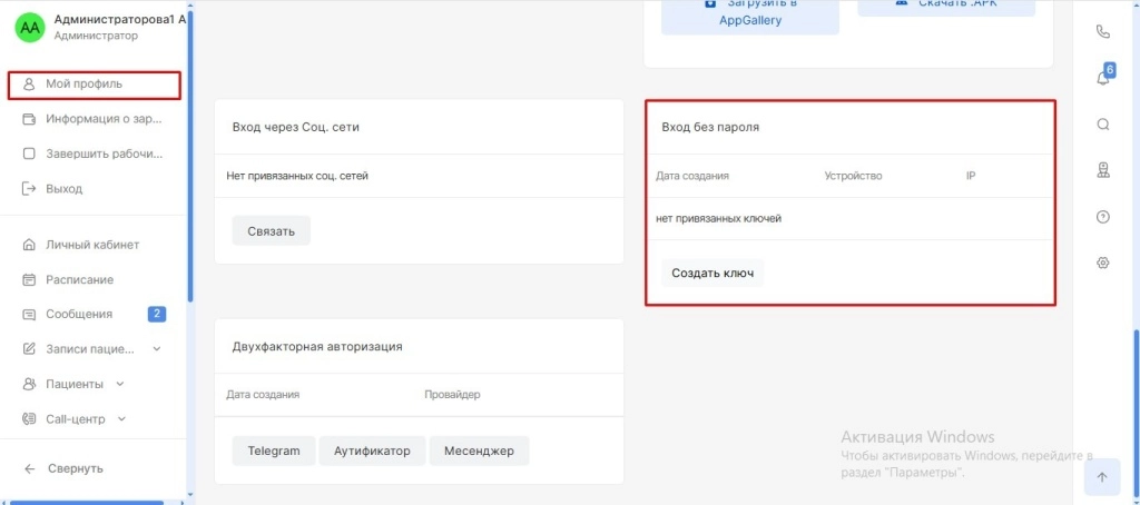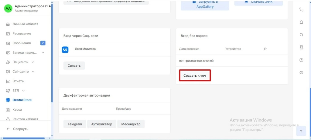 Для привязки необходимо нажать на кнопку “Создать ключ”
