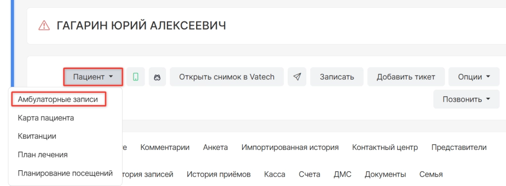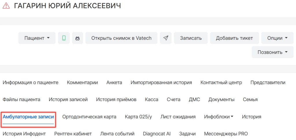также можно выбрать вкладку "Амбулаторные записи в инфокарте пациента;