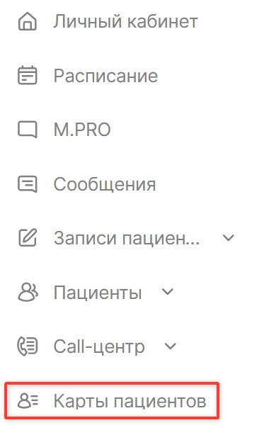 ● из модуля “Карты пациентов” в меню слева;