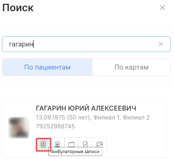 ● из поиска по пациентам (кнопка "Лупа" на панели справа) нажатием знака “Амбулаторные записи”;