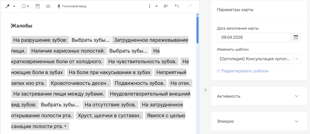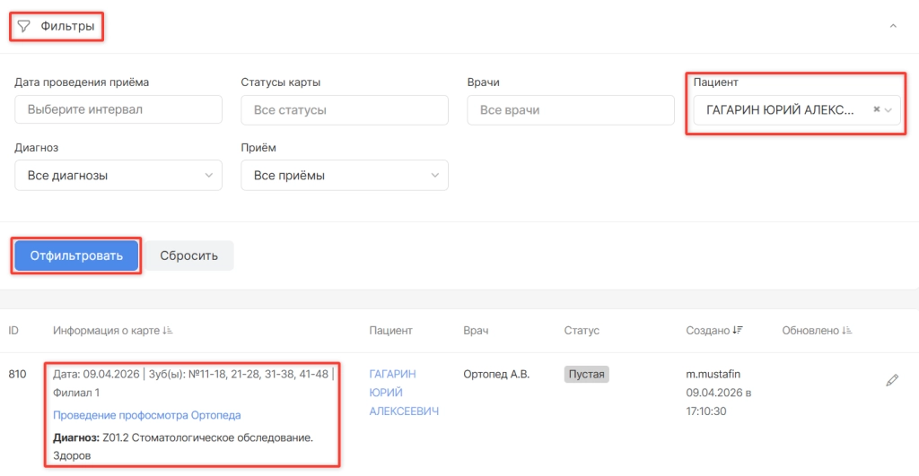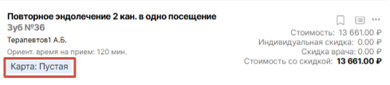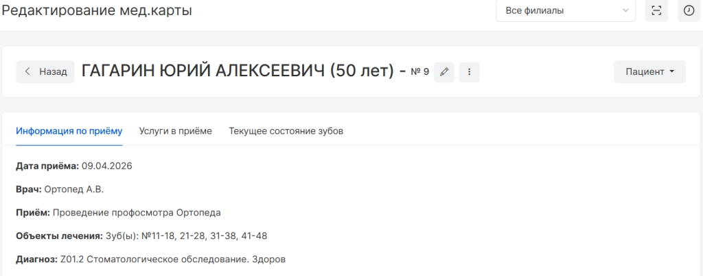 при переходе в модуль найдите пациента, выберите карту для заполнения и нажмите на название приема.