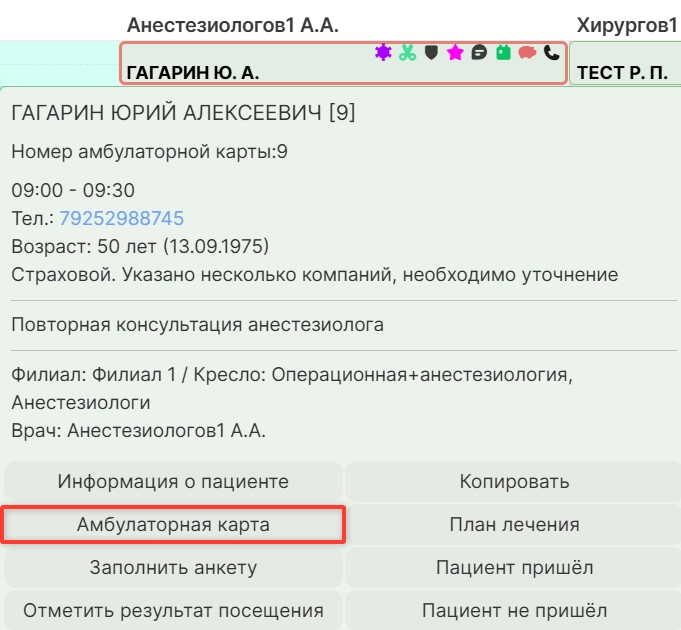 ● через кнопку “Амбулаторная карта” из записи пациента в расписании (открыть окно можно кликом мышки на запись):