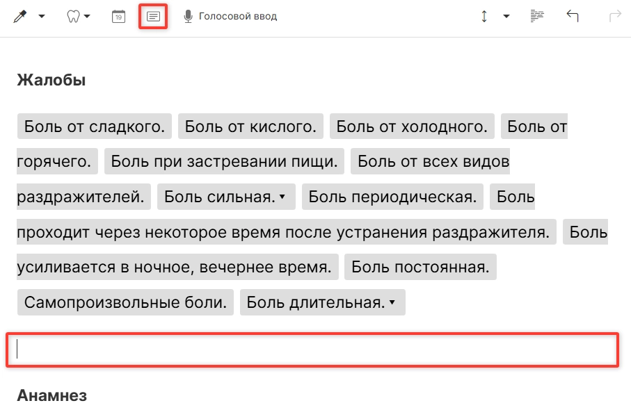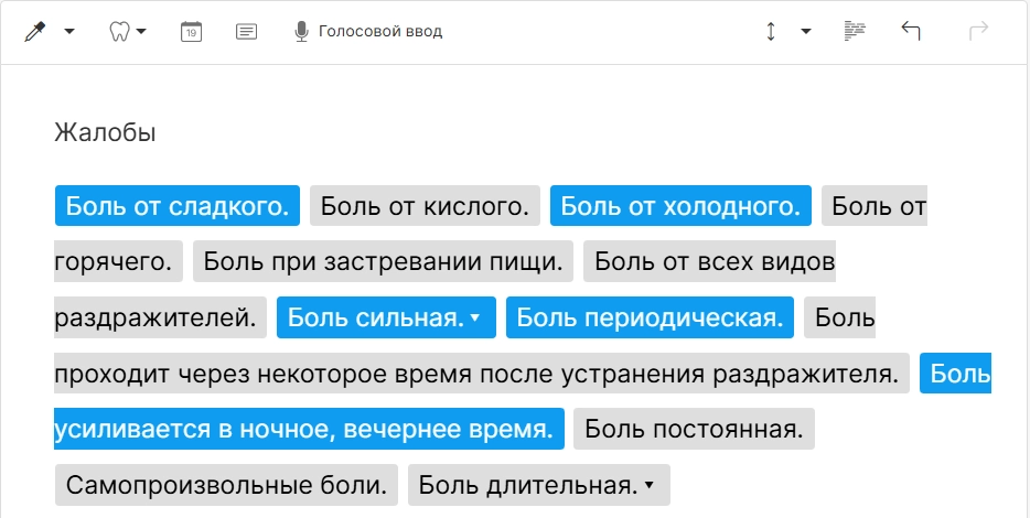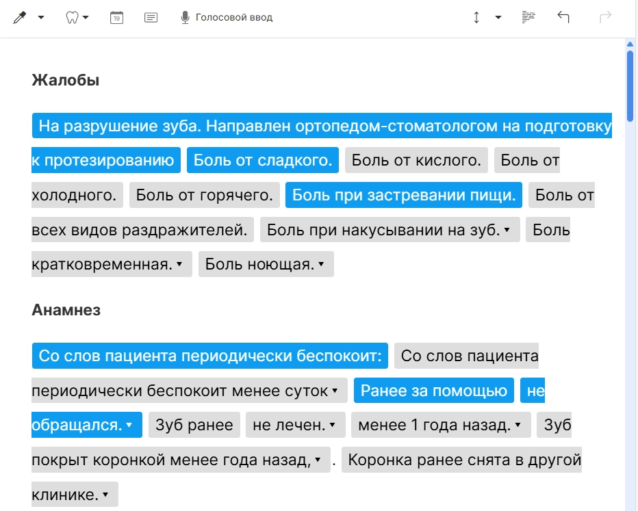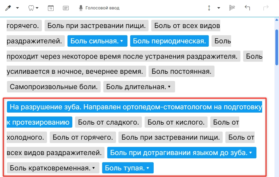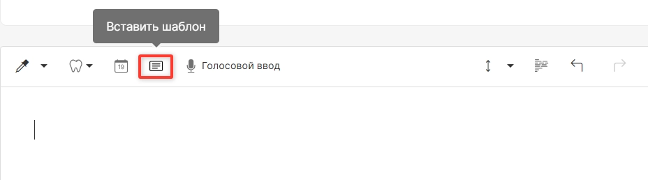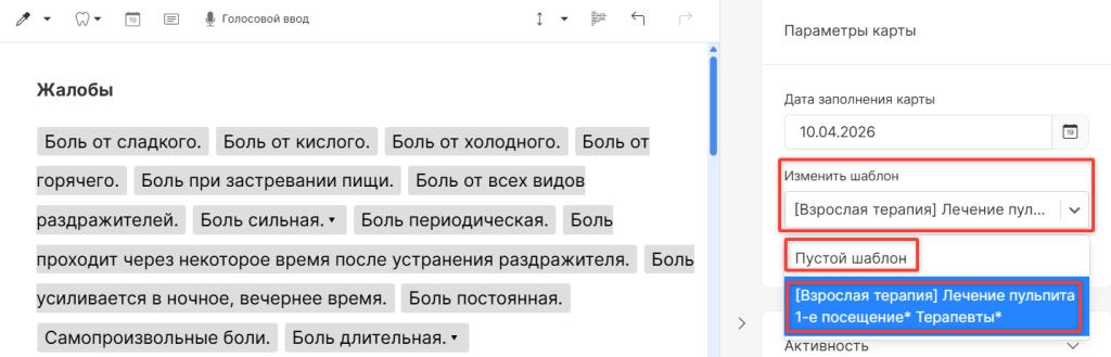 ВНИМАНИЕ! По умолчанию в системе шаблоны карт настроены на конкретные приемы, а не на объединенные. Если в вашей клинике практикуется проведение нескольких приёмов в один день (например, реставрация и чистка), вы можете заранее настроить в системе шаблон по умолчанию для объединенного приема. Подробная инструкция о настройке шаблонов по умолчанию находится в статье Создание шаблона.