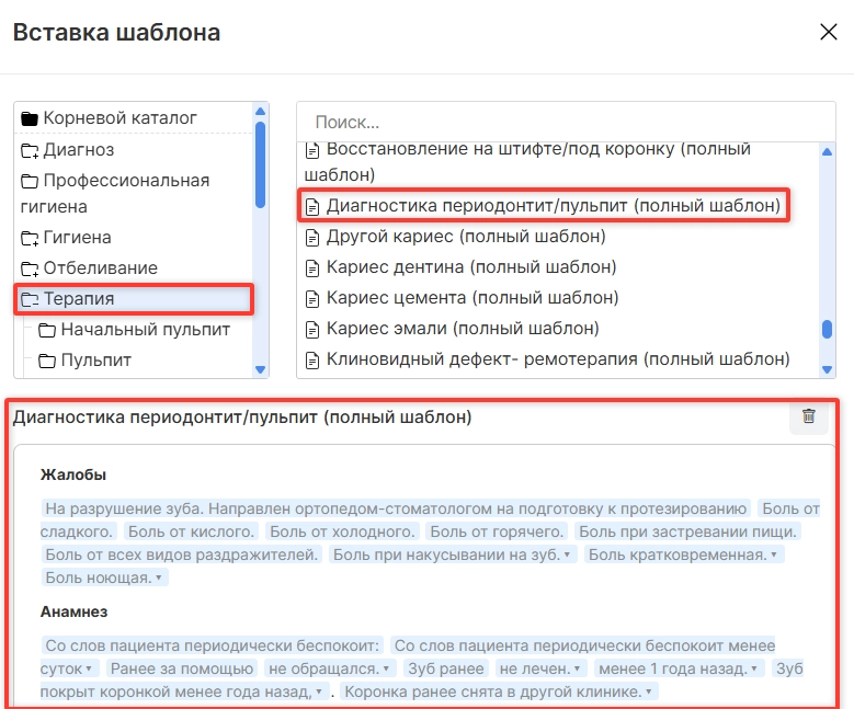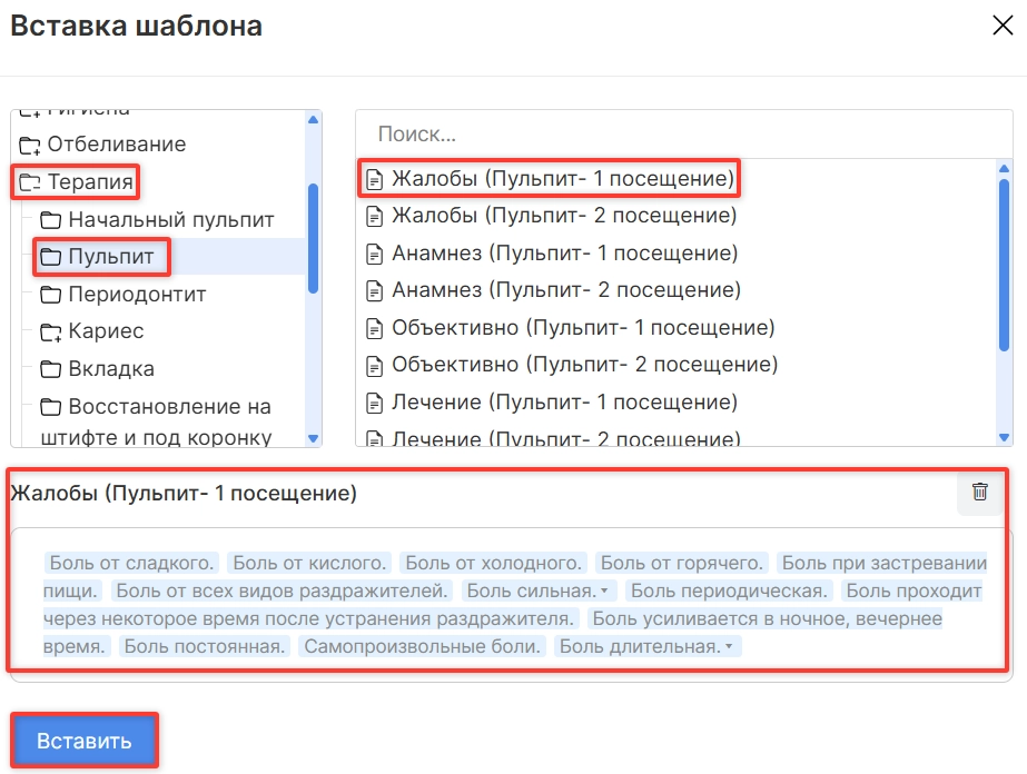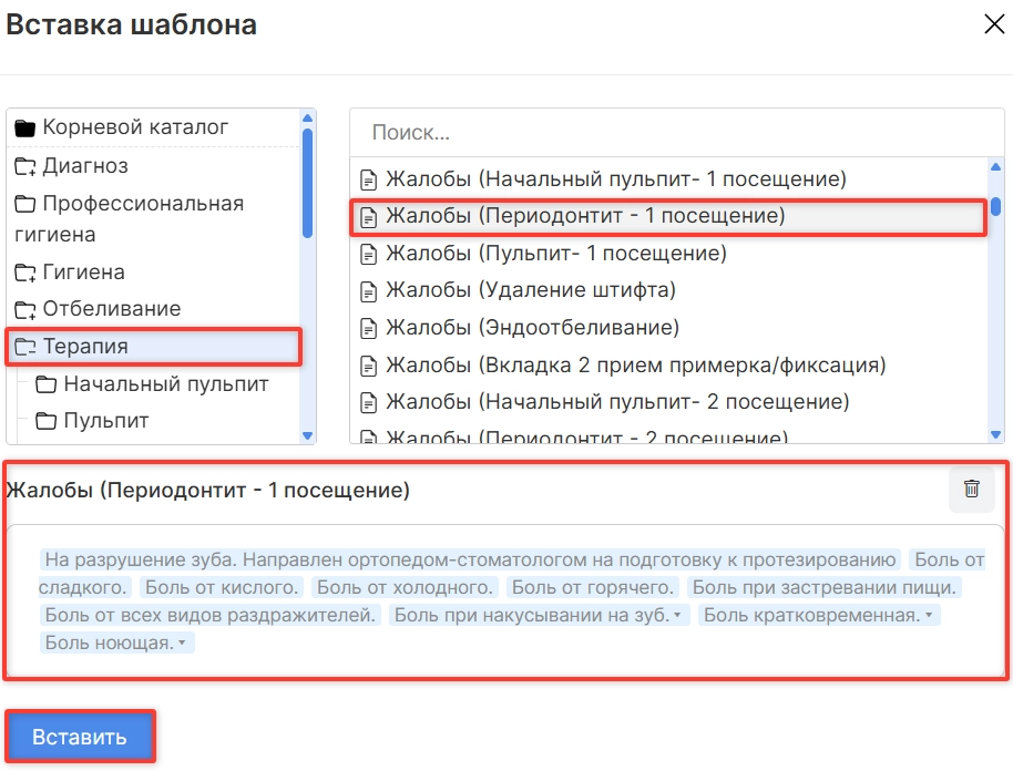 Выберите подходящую папку и вариант текста, соответствующий написанному вручную разделу амбулаторной записи. Содержание выбранного шаблона подтянется в поле ниже. Нажмите опцию “Вставить”.