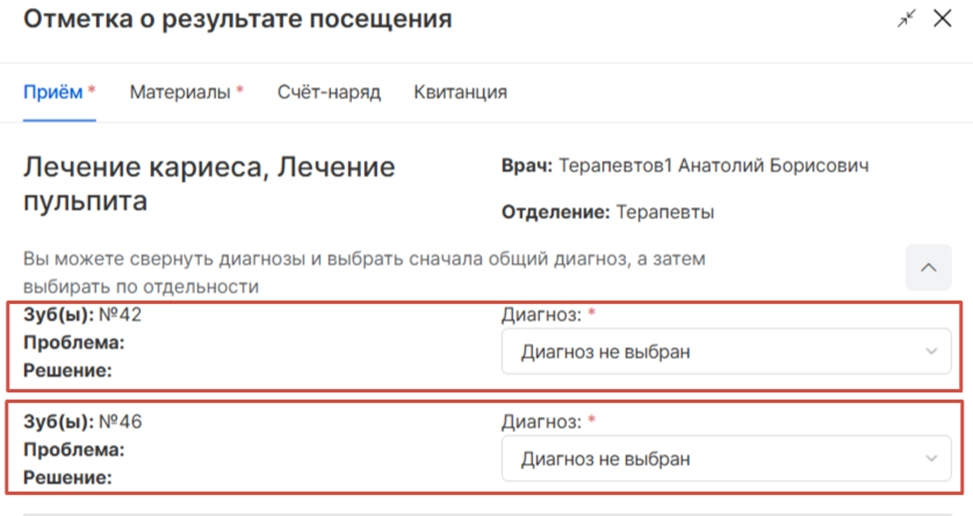 Работая в плане лечения, можно объединить приемы между собой. Это удобно, если в один день были проведены, к примеру, и гигиена, и лечение. После объединения приемов в момент подтверждения и перевода в статус “Факты” можно выбрать диагноз для каждого приема отдельно, однако амбулаторная запись образуется для этих приемов одна.