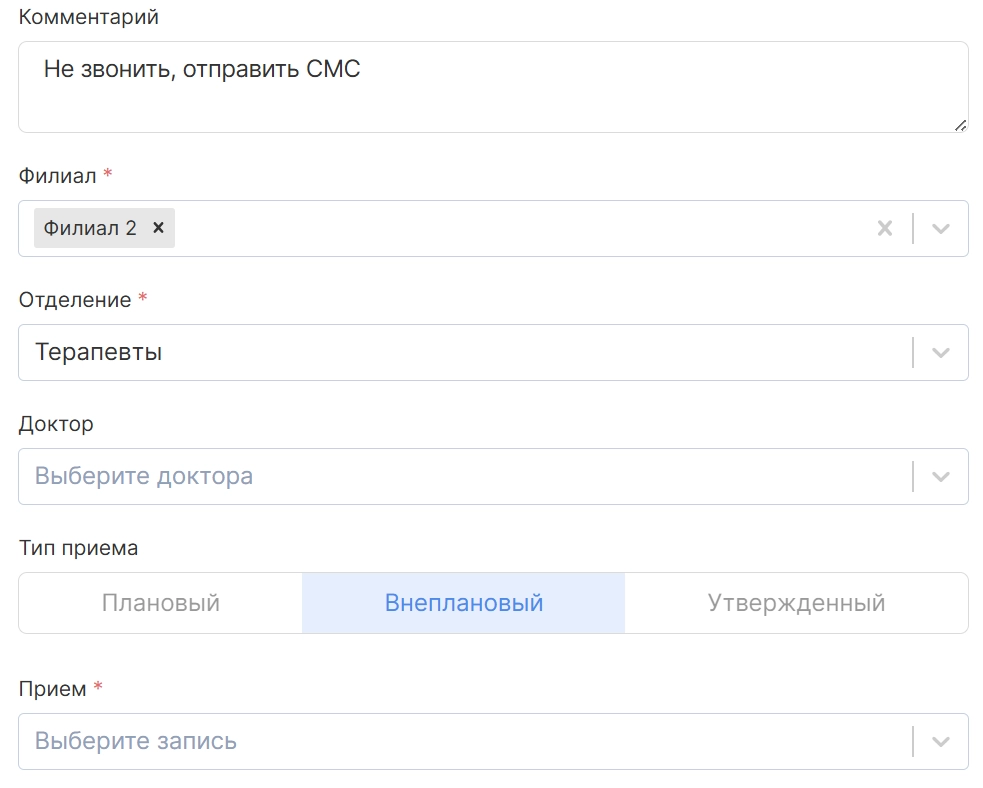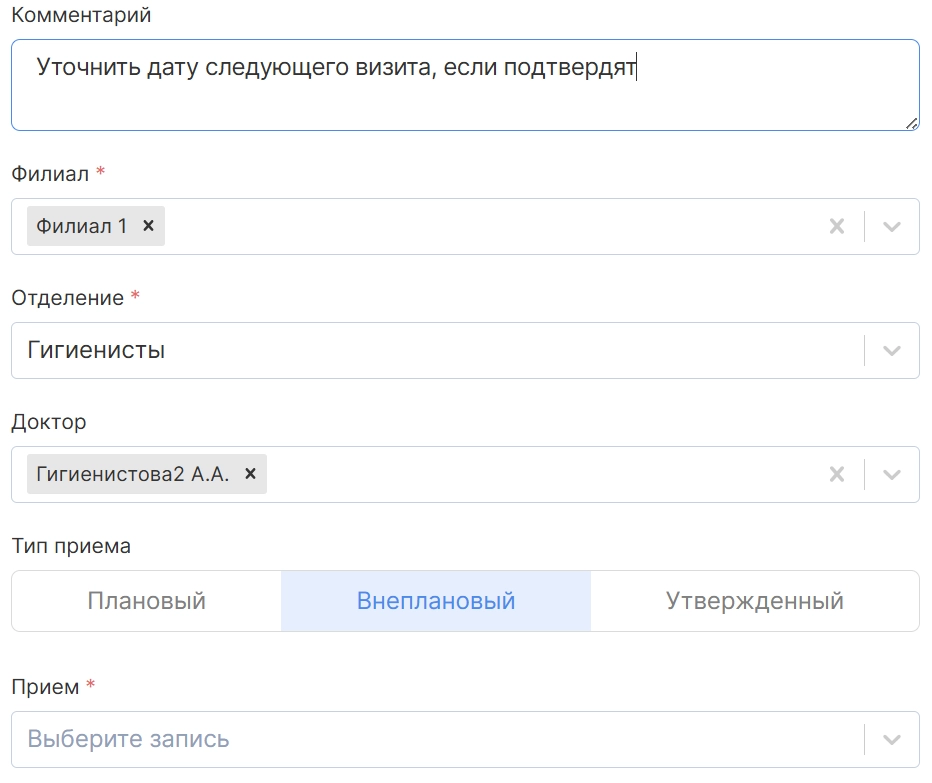 тип приема (отобразится автоматически на основании параметров текущей записи, можно изменить),