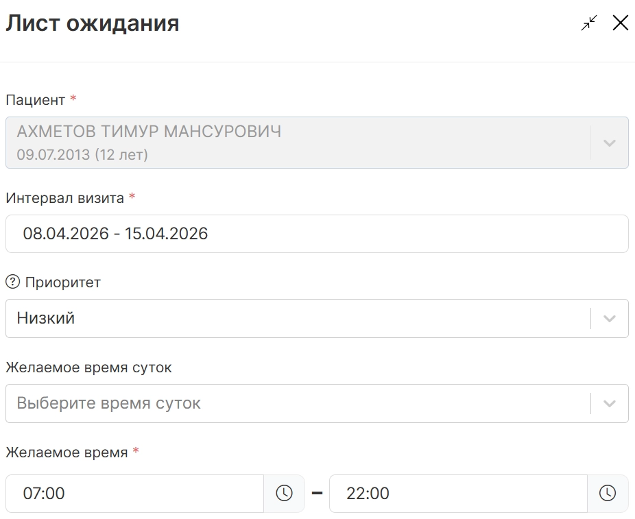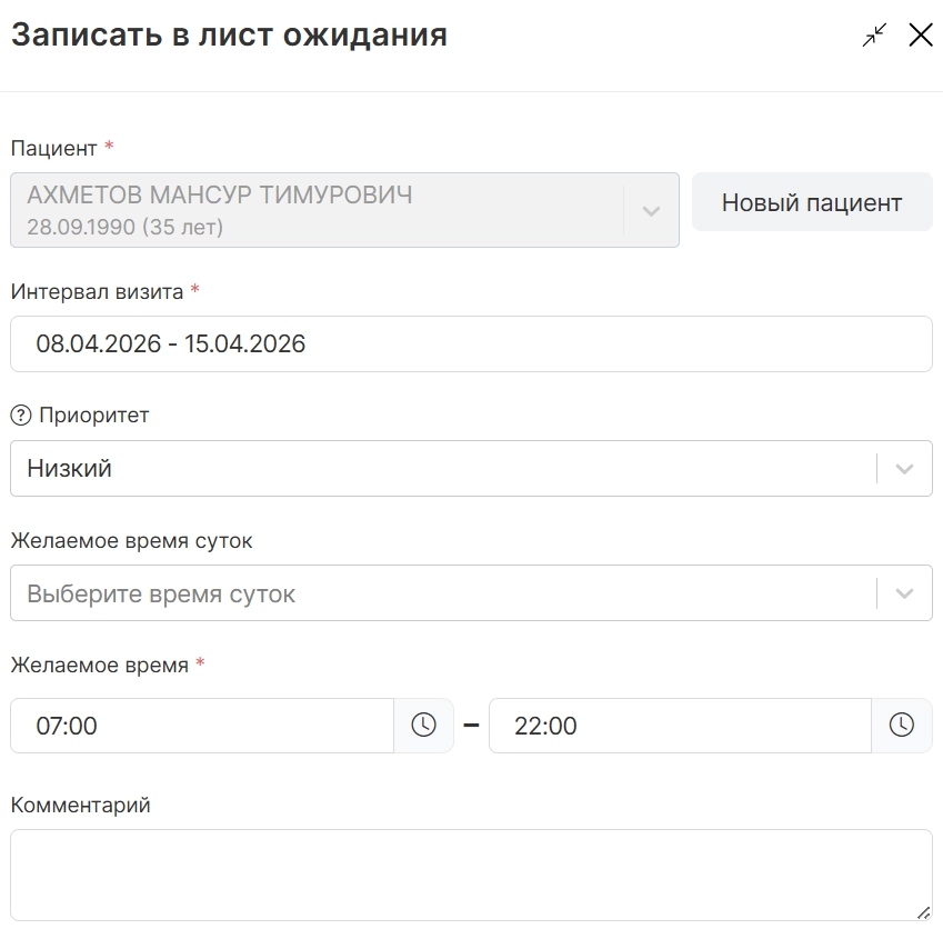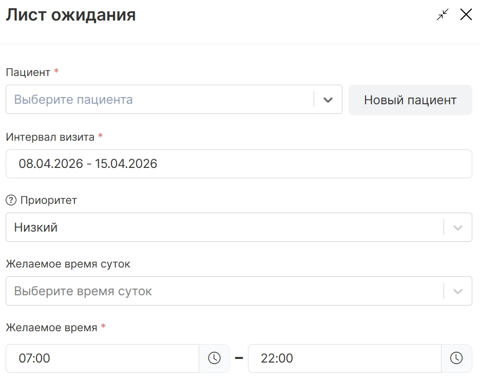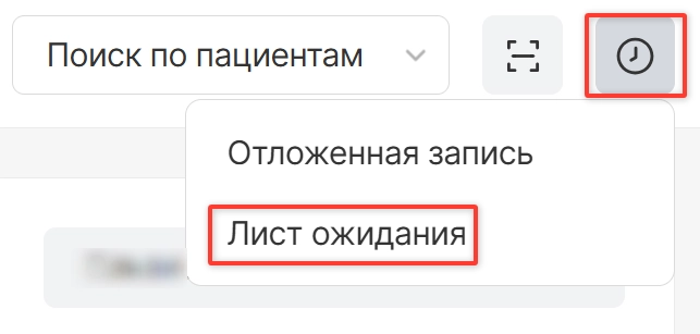 Лист ожидания - функционал, позволяющий формировать список пациентов, которые точно знают, когда хотят прийти, но в клинике на это время нет свободных слотов.