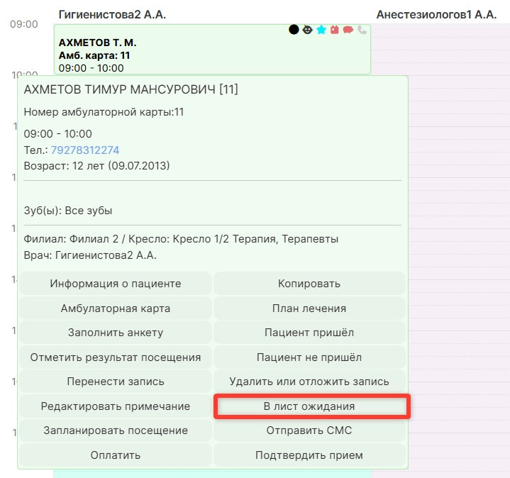 В модуле "Расписание" необходимо нажать на созданную запись пациента один раз левой клавишей мыши и выбрать "В лист ожидания".