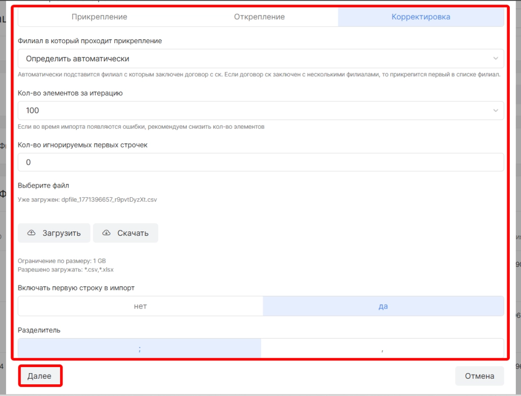 выбрать файл для импорта в формате *.csv,*.xlsx;