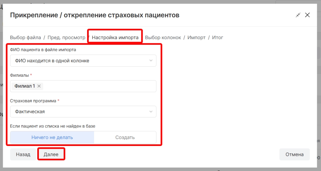 указать что делать с ненайденным пациентом в базе - создавать или пропускать.