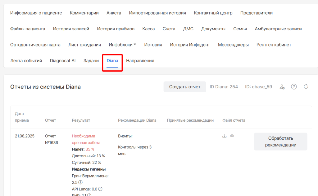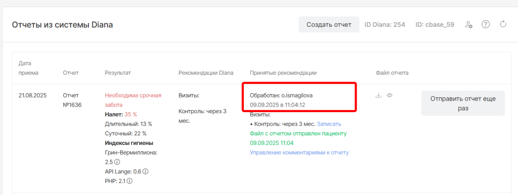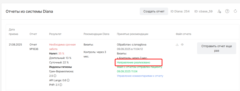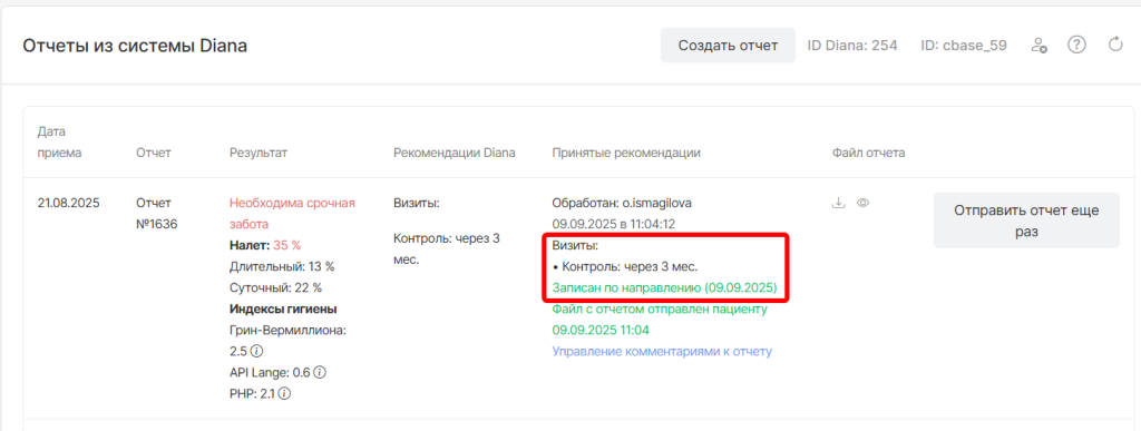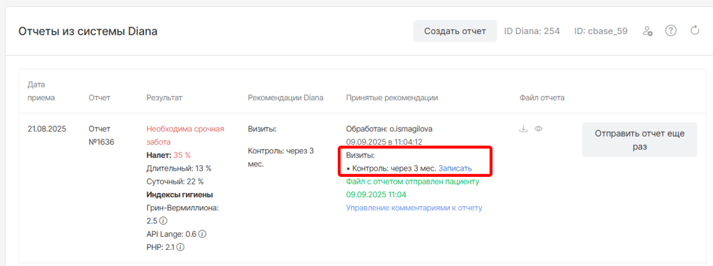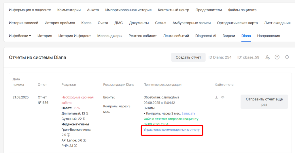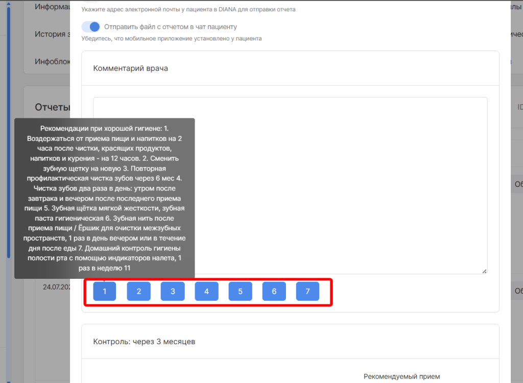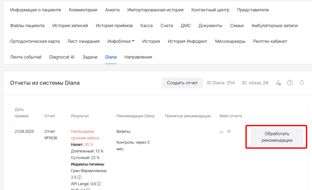 Обработка рекомендаций позволит отправить отчет пациенту, создать направления и проконтролировать работу сотрудников по пациентам. Для использования функционала необходимо: