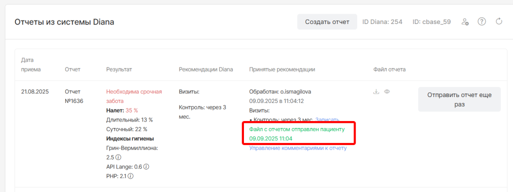 информация об отправке отчета пациенту в мобильное приложение или на почту