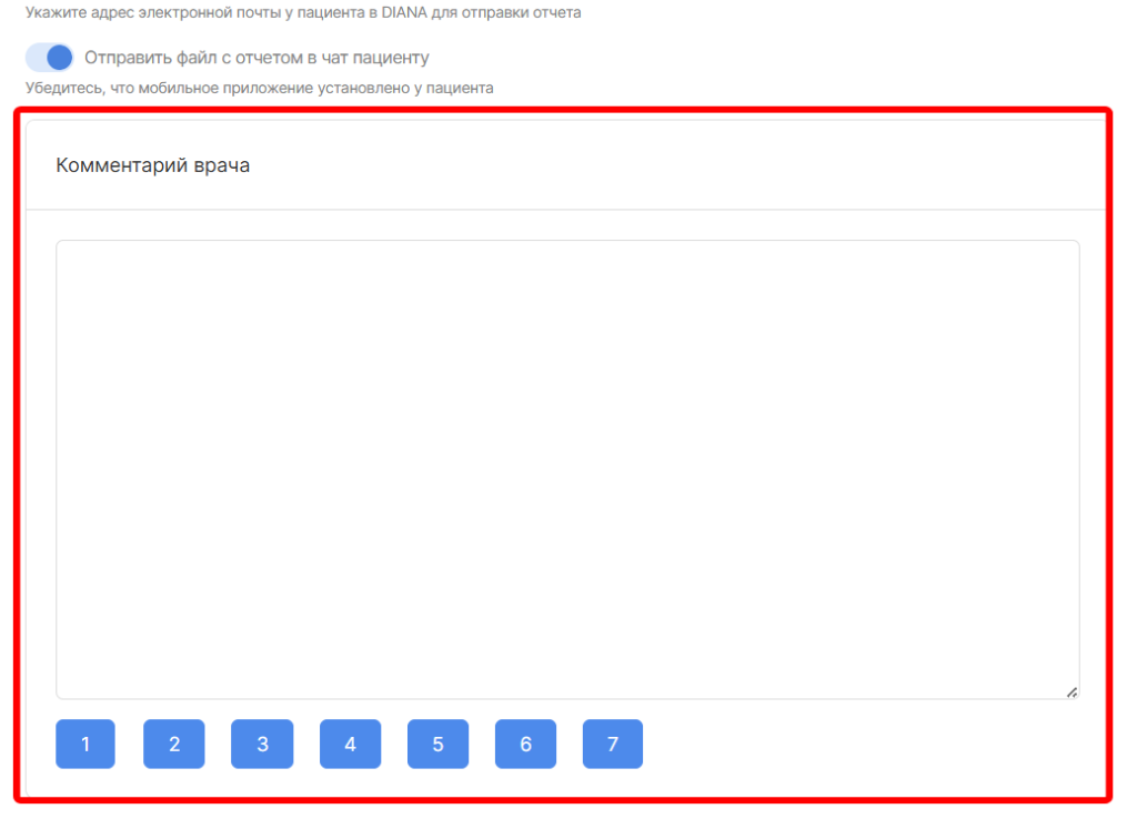 Для данного поля доступно использование настроенных шаблонов, соответствующие шаблонам рекомендаций из сервиса DIANA. При наведении на шаблон откроется его предпросмотр, при нажатии на шаблон он вставляется в поле “Комментарий врача”