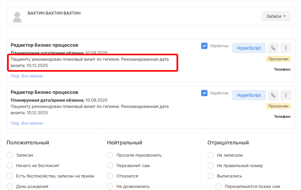 Созданные напоминания отобразятся как тикет в Центре обработки звонков накануне рекомендуемого приема
