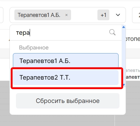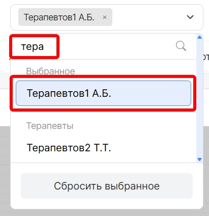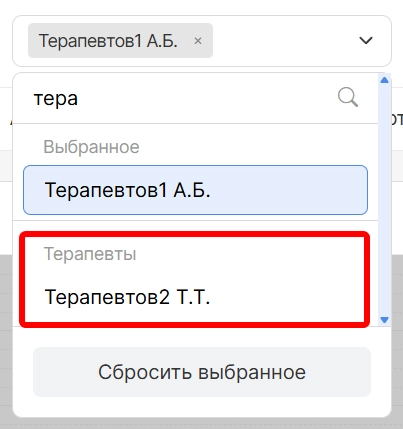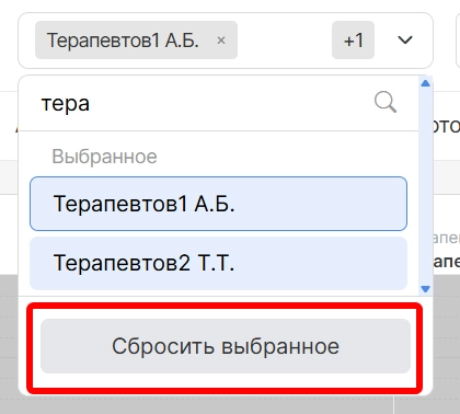 При нажатии на “Сбросить выбранное” будет снят выбор всех докторов.