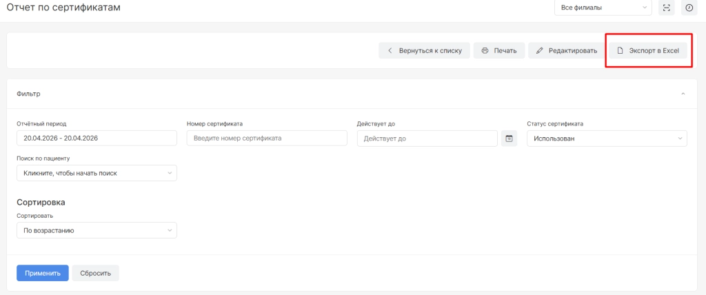 Кнопка «Экспорт в Excel» выгрузит и скачает данный отчет на Ваш компьютер в формате Excel таблицы.
