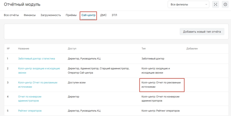 Для того, чтобы воспользоваться отчетом «Рекламные источники», необходимо перейти в модуль «отчеты».