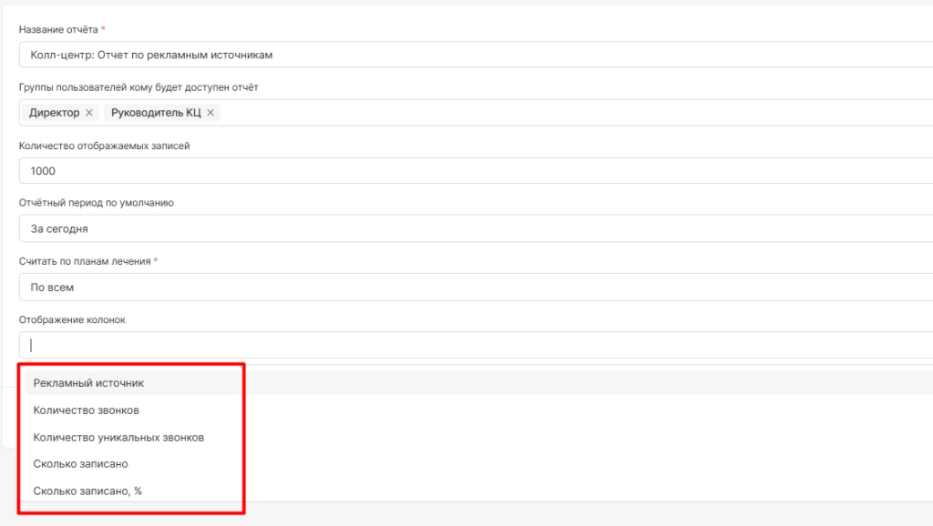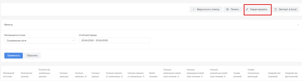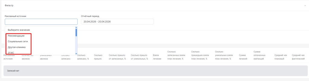 Без интеграции посмотреть статистику по рекламным источникам можно в отчете «Первичные» пациенты с группировкой по Рекламному источнику.