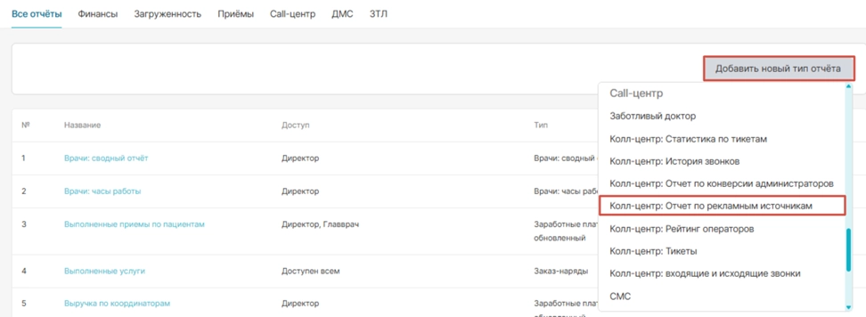 Если отчет в списке не отображается, его можно добавить через кнопку «Добавить новый тип отчета» и выбрать тип «Отчет по рекламным источникам»
