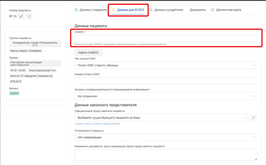 указать СНИЛС пациента (обязательное поле)