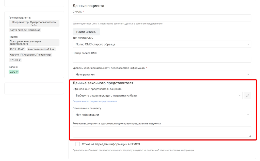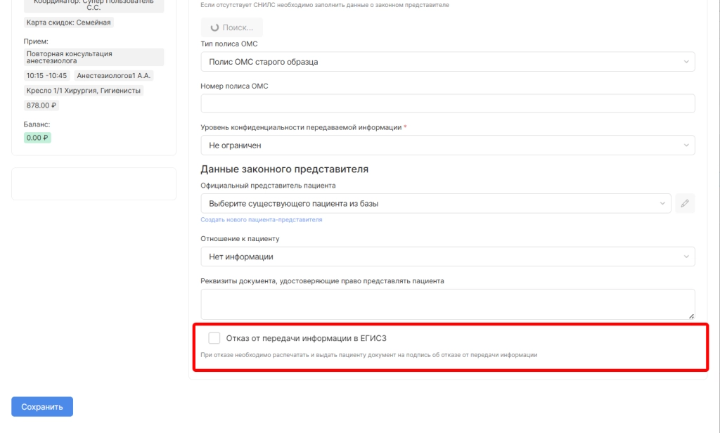 Если пациент отказывается от предоставления данных в ЕГИСЗ необходимо выбрать опцию “Отказ от передачи информации в ЕГИСЗ”