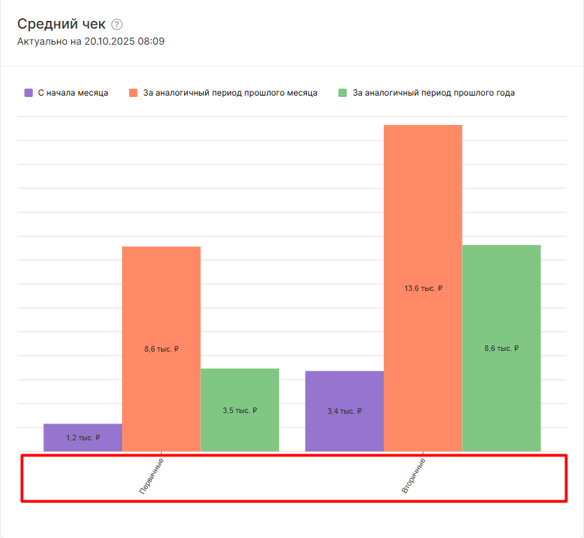 Виджет “Средний чек” отображает средний чек по первичным и вторичным посещениями клиники, в сопоставлении трех временных периодов: текущий месяц, аналогичный период прошлого месяца, аналогичный период прошлого года.